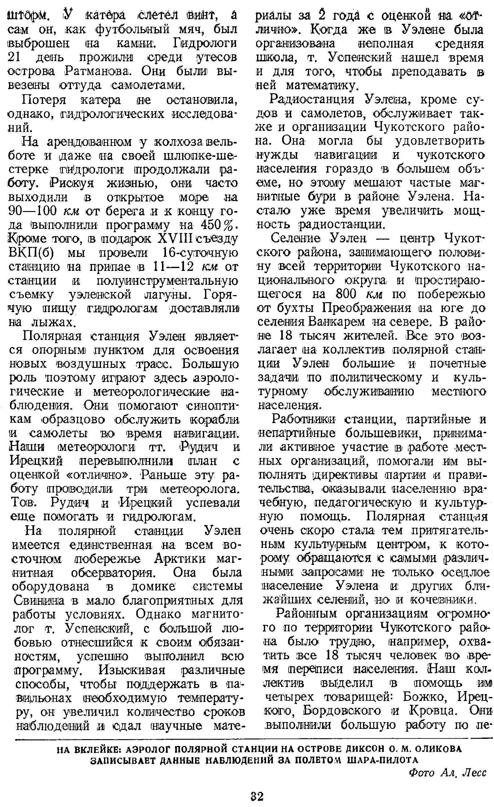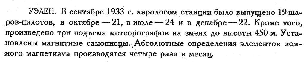 УЭЛЕН. В сентябре 1933 г. аэрологом станции было выпущено 19 шаров-пилотов, в октябре — 21, в июле — 24 и в декабре — 22. Кроме того, произведено три подъема метеорографов на змеях до высоты 450 м. Установлены магнитные самописцы. Абсолютные определения элементов земного магнетизма производятся четыре раза в месяц.