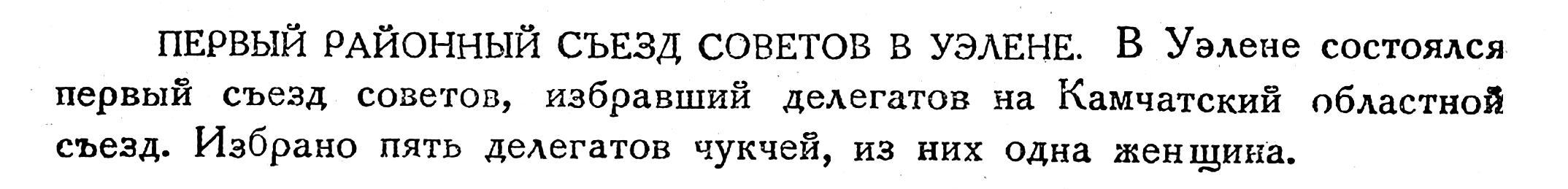 ПЕРВЫЙ РАЙОННЫЙ СЪЕЗД СОВЕТОВ В УЭЛЕНЕ. В Уэлене состоялся первый съезд советов, избравший делегатов на Камчатский областной съезд. Избрано пять делегатов чукчей, из них одна женщина.