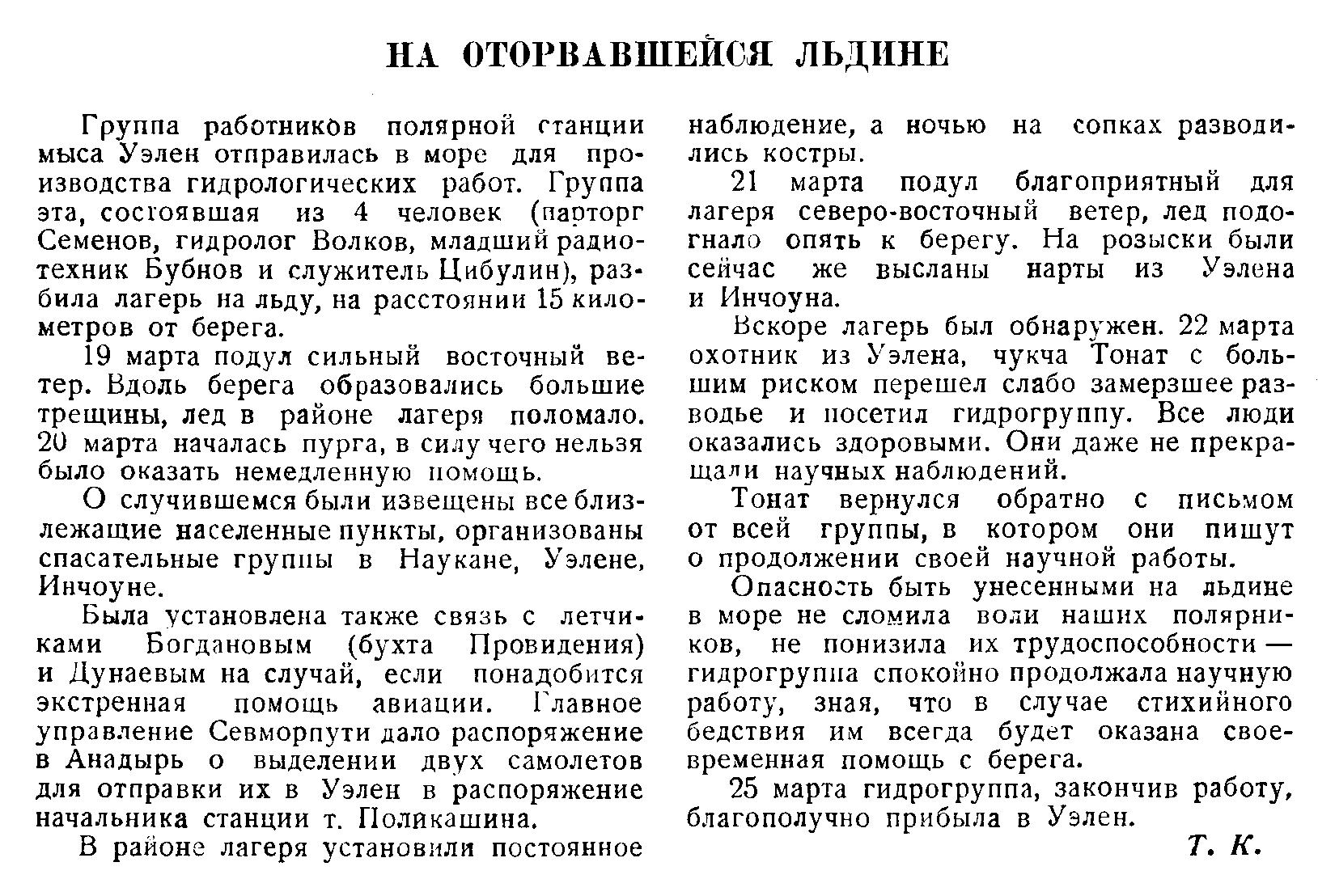 Вчера вечером в Главном управлении Северного морского пути получена радиограмма из Уэллена. В радиограмме сообщается, что утром 22 марта местный охотник-чукча отправился на поиски товарищей, унесенных на льдине. Через одиннадцать часов чукча вернулся на побережье и рассказал, что ему удалось по тонкому льду добраться до расположения лагеря гидрологов. Они прислали с охотником записку, в которой сообщают, что здоровы, бодры и продолжают научную работу.