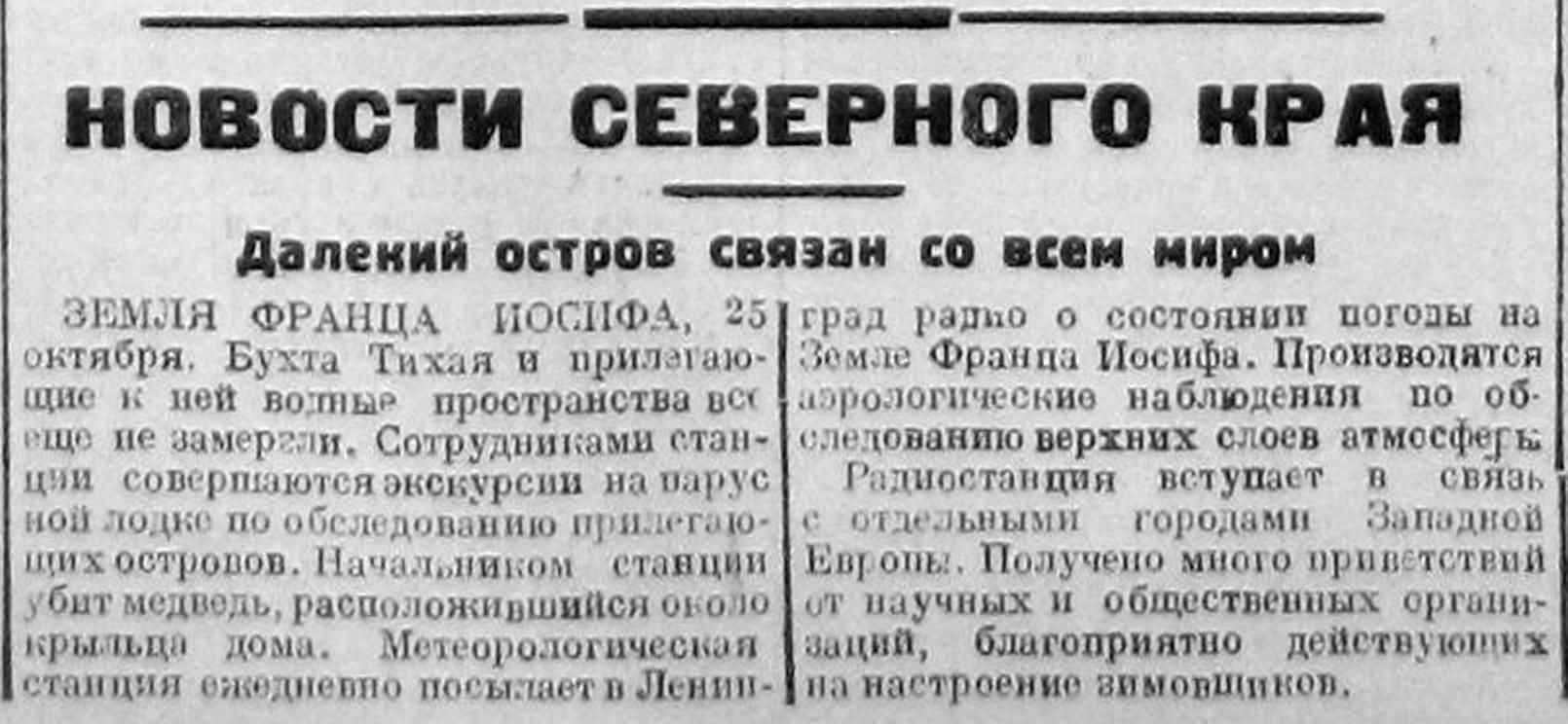 ЗЕМЛЯ ФРАНЦА ИОСИФА, 25 октября. Бухта Тихая и прилегающие к ней водные пространства все еще не замерзли. Сотрудниками станции совершаются экскурсии на парусной лодке по обследованию прилегающих островов. Начальником станции убит медведь, расположившийся около крыльца дома. Метеорологическая станции ежедневно посылает в Ленинград радио о состоянии погоды на Земле Франца Иосифа. Производятся аэрологические наблюдения по обследованию верхних слоев атмосферы. Радиостанция вступает в связь с отдельными городами Западной Европы. Получено много приветствий от научных и общественных организаций, благоприятно действующих на настроение зимовщиков.