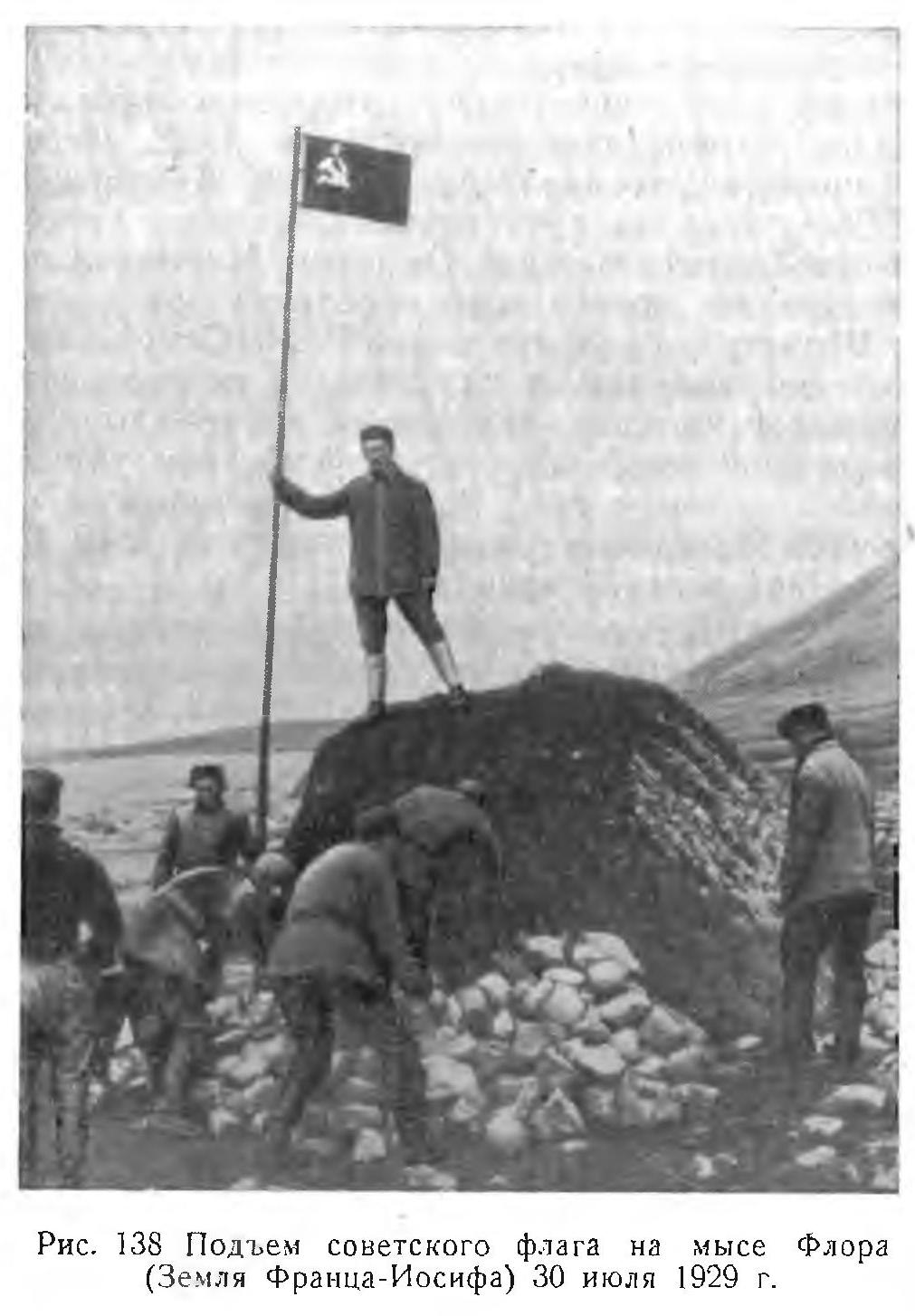 {2} При посещении мыса Флора советская экспедиция обнаружила повреждение поставленного там в 1929 г. советского флага. Этот флаг был сделан из железа и укреплен на металлическом флагштоке. Он оказался пригнутым к земле, на которой ясно виднелись человеческие следы.