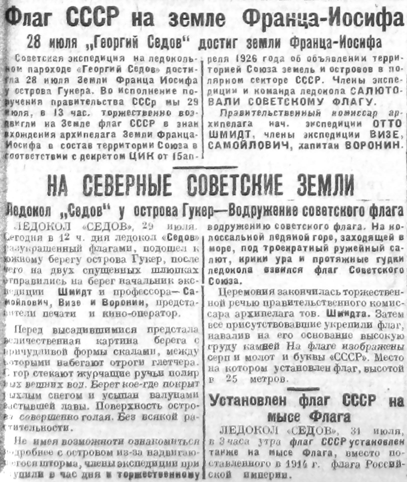 Советская экспедиция на ледокольном пароходе «Георгий Седов" достигла 28 июля Земли Франца Иосифа у острова Гукера. Во исполнение поручения правительства СССР мы 29 июля, в 13 час. торжественно воздвигли на Земле флаг СССР в знак вхождения архипелага Земли Франца-Иосифа в состав территории Союза в соответствии с декретом ЦИК от 15 апреля 1926 года об объявлении территорией Союза земель и островов в полярном секторе СССР. Члены экспедиции и команда ледокола САЛЮТОВАЛИ СОВЕТСКОМУ ФЛАГУ.