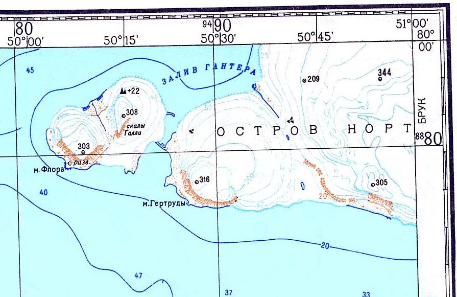 Надо полагать, что под мысом Флага подразумевается мыс Флора на о. Нортбрук, а теперь как-бы на о. Юрия Кучиева.