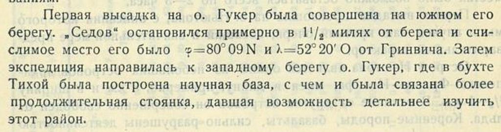 шение для плавания в советских территориальных водах {1}. В разговоре с капитанами норвежских судов выяснилось, что хотя они и слышали о советской полярной станции в бухте Тихой, но не верили в ее существование. В том же 1930 г. у мыса Гукера, в 9 милях от берега, советские моряки обнаружили шхуну «Викинг», пытавшуюся подойти к берегу. О. Ю. Шмидт предложил капитану шхуны немедленно покинуть советские территориальные воды {2}.