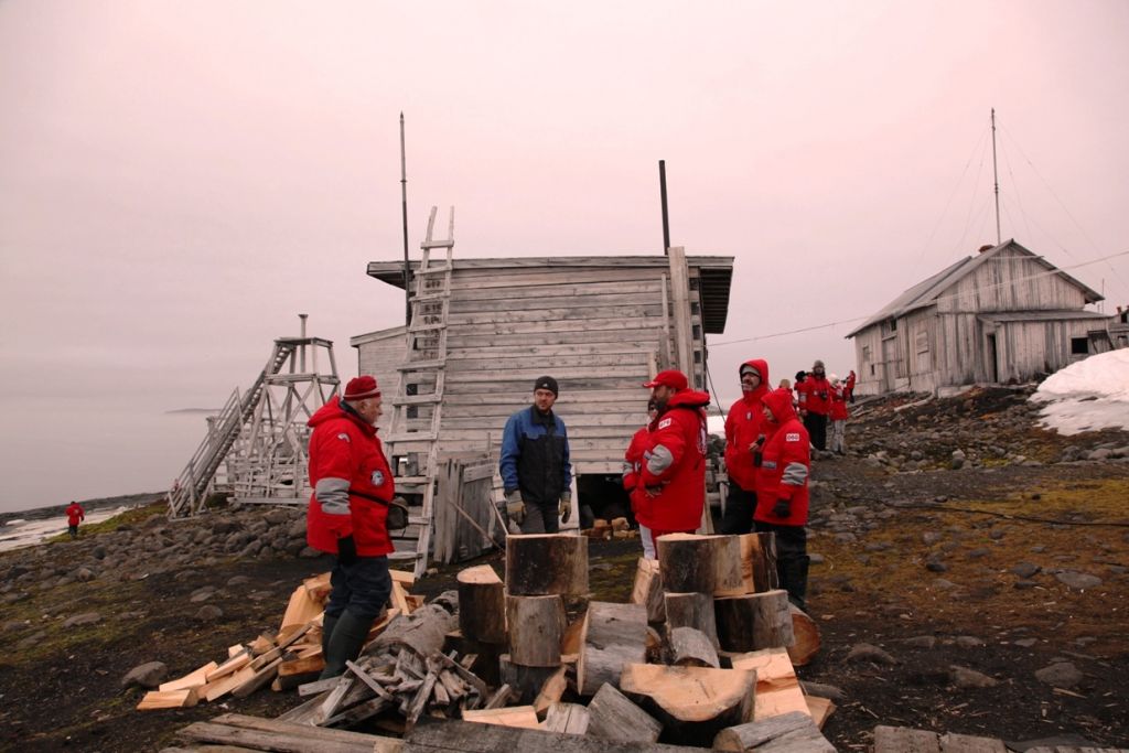 Вначале мы услышали звуки топора, а затем увидели и человека, колющего дрова. Оказалось, что на берегу работает из Архангельска, четверо ребят, сотрудников заповедника, приехали на тройку месяцев с целью подготовки территории Федерального заказника "Земля Франца-Иосифа" к капитальной уборке.
