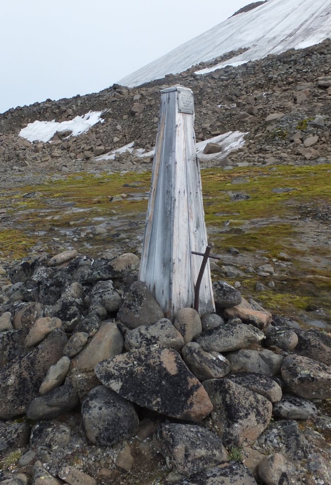 Мы подошли к восьмиконечному православному деревянному кресту, установленному в 1929 году на том самом месте, где Георгием Седовым был построен астрономический пункт. Последнее, я имею в виду строительство астрономического пункта, очень и очень примечательно. Речь идет о том, что, несмотря на тяготы, постигшие экспедицию, голод и цингу, Седов и его команда вели плановые регулярные научные исследования, результаты которых и заносились в дневники, доставленные впоследствии на Родину.