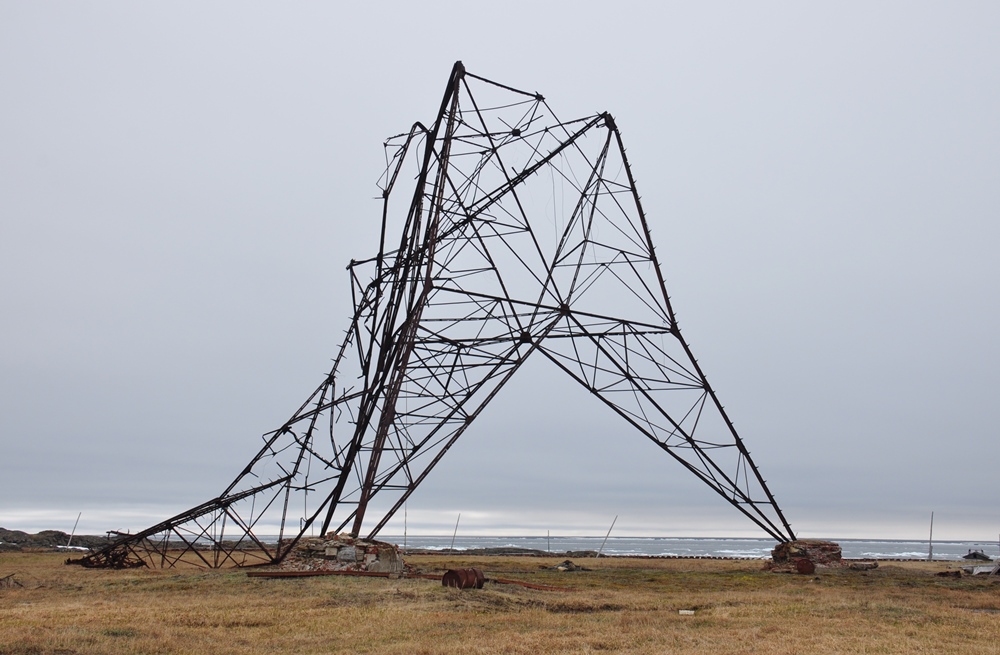 Ажурная метеллическая радиомачта полярной станции Югорский Шар, а рядом уже частично разрушенный каменный дом станции.