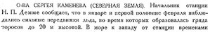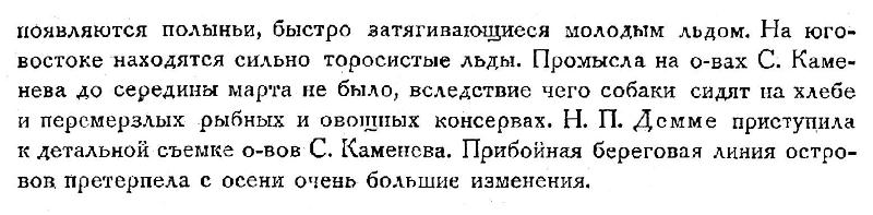 О-ВА СЕРГЕЯ КАМЕНЕВА (СЕВЕРНАЯ ЗЕМЛЯ). Начальник станции Н. П. Демме сообщает, что в январе и первой половине февраля наблюдались сильные передвижки льда, во время которых образовалась гряда торосов до 20 м высотой. В море к западу от станции временами появляются полыньи, быстро затягивающиеся молодым льдом. На юго-востоке находятся сильно торосистые льды. Промысла на о-вах С. Каменева до середины марта не было, вследствие чего собаки сидят на хлебе и перемерзлых рыбных и овощных консервах. Н. П. Демме приступила к детальной съемке о-вов С. Каменева. Прибойная береговая линия островов претерпела с осени очень большие изменения.