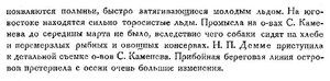 СТАНЦИЯ НА О-ВАХ СЕРГЕЯ КАМЕНЕВА. Вследствие тяжелых льдов, предполагавшаяся смена личного состава в этом году не состоялась. Персонал станции, в составе начальника станции Н. П. Демме, метеоролога 3енкова, радиста Иойлева и служителя Мировича, готовится к вторичной зимовке. Продовольствием и снаряжением станция обеспечена была на три года.