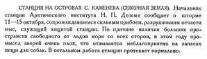 СТАНЦИЯ НА ОСТРОВАХ С. КАМЕНЕВА (СЕВЕРНАЯ ЗЕМЛЯ). Начальник станции Арктического института Н. П. Демме сообщает о шторме 11—15 октября, сопровождавшемся сильным прибоем, разрушившим отчасти мыс, служащий защитой станции. По причине наличия больших пространств свободного от льдов моря со всех сторон, в этом году промысел зверей очень плох, что отзывается неблагоприятно на запасах пищи для собак. В остальном работа станции протекает нормально.