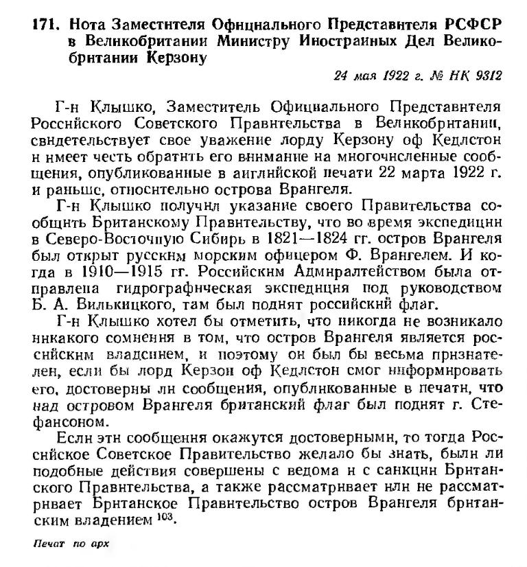 Г-н Клышко, Заместитель Официального Представителя Российского Советского Правительства в Великобритании, свидетельствует свое уважение лорду Керзону оф Кедлстон и имеет честь обратить его внимание на многочисленные сообщения, опубликованные в английской печати 22 марта 1922 г. и раньше, относительно острова Врангеля.