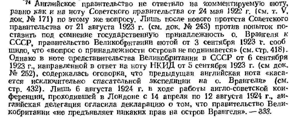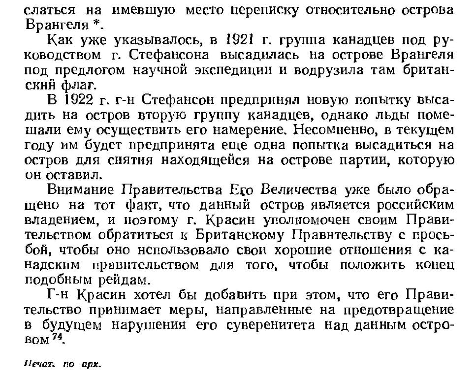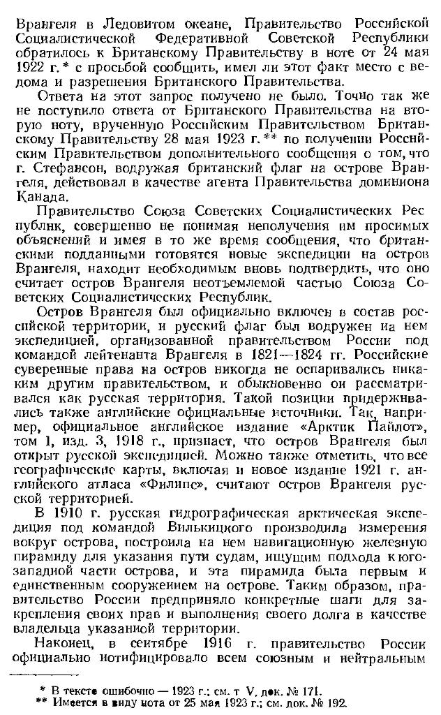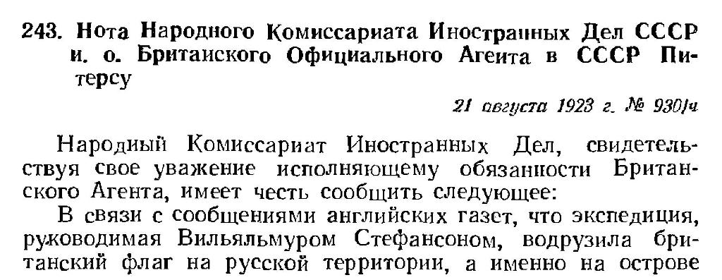 В связи с сообщениями английских газет, что экспедиция, руководимая Вильяльмуром Стефансоном, водрузила британский флаг на русской территории, а именно на острове Врангеля в Ледовитом океане, Правительство Российской Социалистической Федеративной Советской Республики обратилось к Британскому Правительству в ноте от 24 мая 1922 г. * с просьбой сообщить, имел ли этот факт место с ведома и разрешения Британского Правительства.