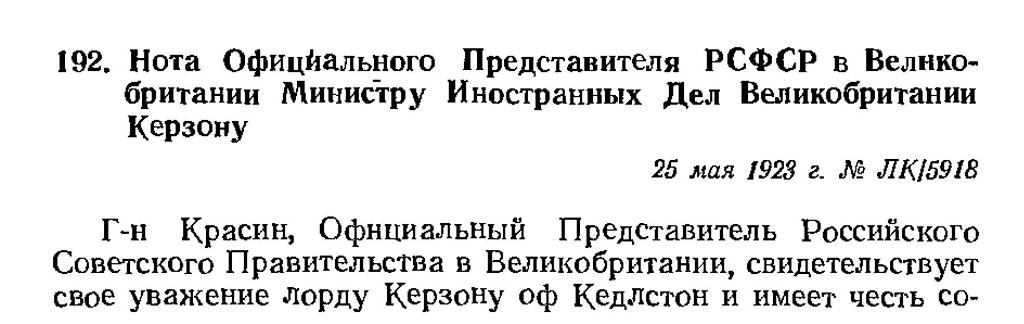 192. Нота Официального Представителя РСФСР в Великобритании Министру Иностранных Дел Великобритании Керзону
