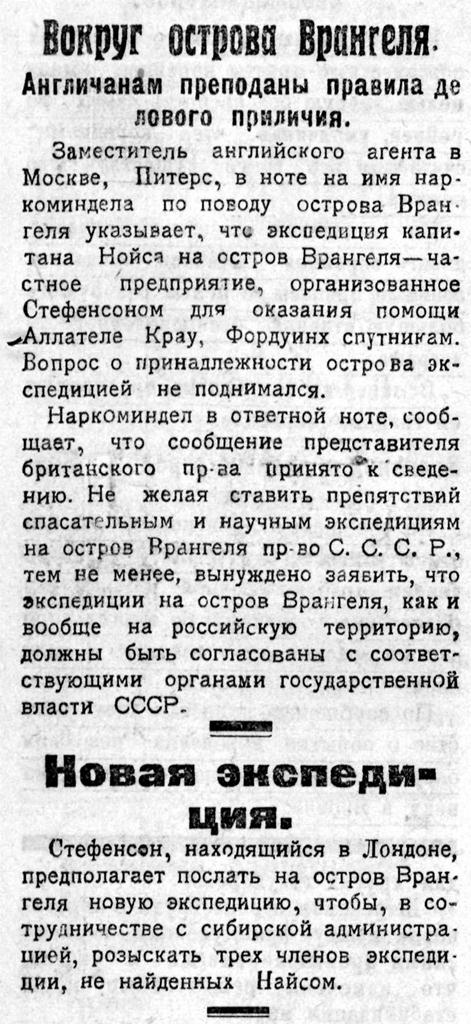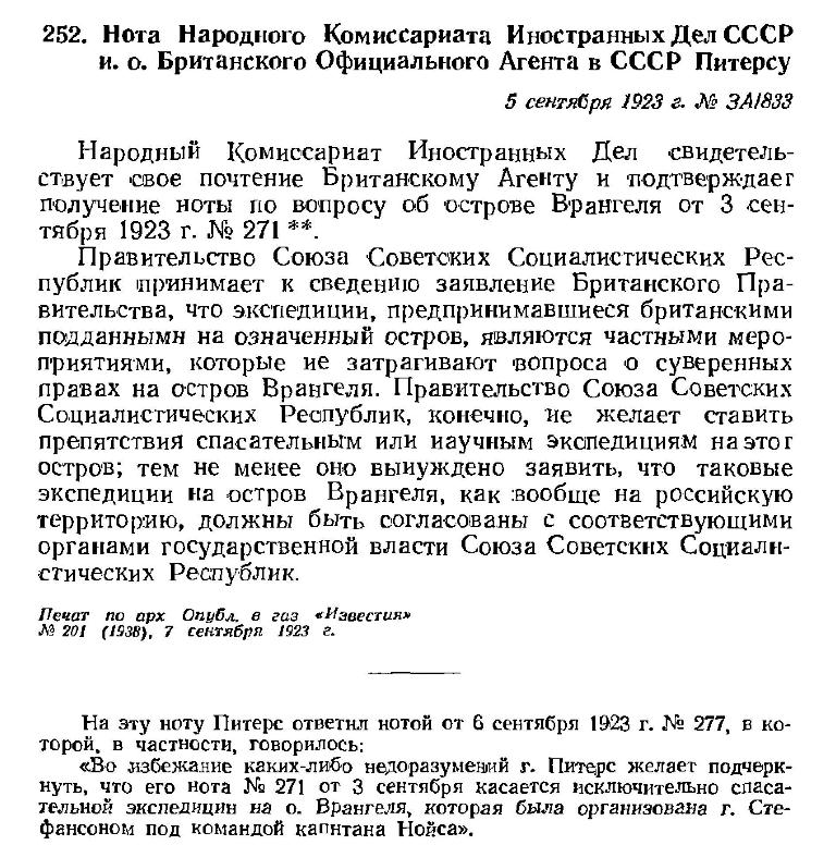 Наркоминдел в ответной ноте, сообщает, что сообщение представителя британского пр-ва принято к сведению. Не желая ставить препятствий спасательным и научным экспедициям на остров Врангеля пр во С. С. С. Р., тем не менее, вынуждено заявить, что экспедиции на остров Врангеля, как и вообще на российскую территорию, должны быть согласованы с соответствующими органами государственной власти СССР.