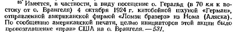 {85} Имеется, в частности, в виду посещение о. Геральд (в 70 км к востоку от о. Врангеля) 4 октября 1924 г. китобойной шхуной «Герман», отправленной американской фирмой «Ломэн бразерз» из Нома (Аляска). По сообщению американской печати, целью инициаторов этой акции было провозглашение «прав» США на о. Врангеля. — 531.