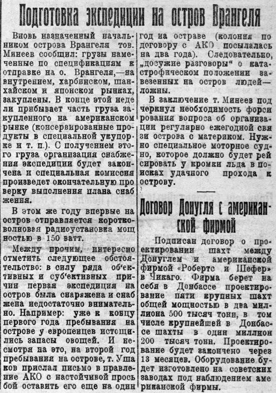 Вновь назначенный начальником острова Врангеля тов. Минеев сообщил: грузы намеченные по спецификациям к отправке на о. Врангеля, — на внутреннем, харбинском, шанхайском и японском рынках, закуплены. В конце этой недели прибывает часть груза закупленного на американском рынке (консервированные продукты в специальной укупорке и т. п.). С получением этого груза организация снабжения экспедиции будет закончена и специальная комиссия произведет окончательную проверку выполнения плана снабжения.