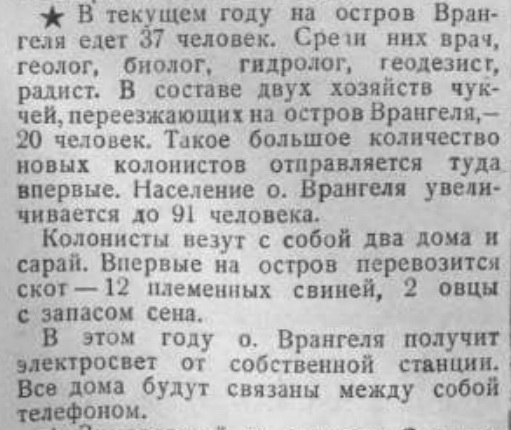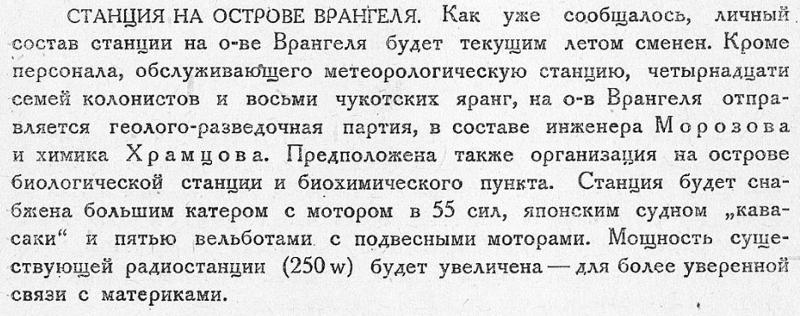 СТАНЦИЯ НА ОСТРОВЕ ВРАНГЕЛЯ. Как уже сообщалось, личный состав станции на о-ве Врангеля будет текущим летом сменен. Кроме персонала, обслуживающего метеорологическую станцию, четырнадцати семей колонистов и восьми чукотских яранг, на о-в Врангеля отправляется геолого-разведочная партия, в составе инженера Морозова и химика Храмцова. Предположена также организация на острове биологической станции и биохимического пункта. Станция будет снабжена большим катером с мотором в 55 сил, японским судном „кавасаки“ и пятью вельботами с подвесными моторами. Мощность существующей радиостанции (250 w) будет увеличена — для более уверенной связи с материками.