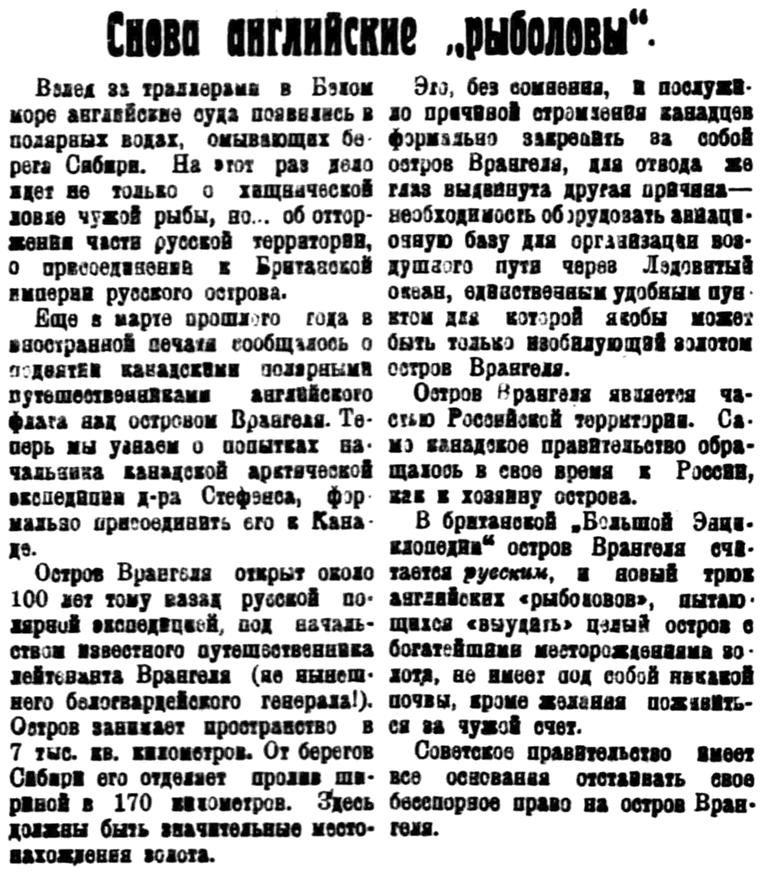 Вслед за траллерами в Белом море английские суда появились в полярных водах, омывающих берега Сибири. На этот раз дело идет не только о хищнической ловле чужой рыбы, но... об отторжении части русской территории, о присоединении к Британской империи русского острова.