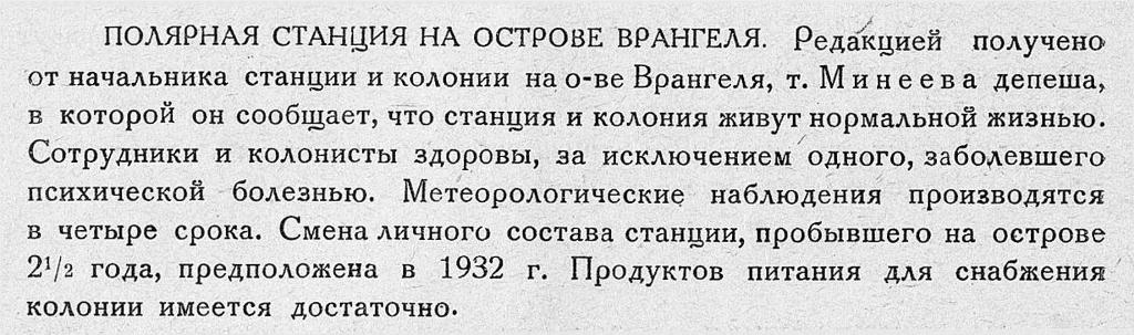 ПОЛЯРНАЯ СТАНЦИЯ НА ОСТРОВЕ ВРАНГЕЛЯ. Редакцией получено от начальника станции и колонии на о-ве Врангеля, т. Минеева депеша, в которой он сообщает, что станция и колония живут нормальной жизнью. Сотрудники и колонисты здоровы, за исключением одного, заболевшего психической болезнью. Метеорологические наблюдения производятся в четыре срока. Смена личного состава станции, пробывшего на острове 2 1/2 года, предположена в 1932 г. Продуктов питания для снабжения колонии имеется достаточно.