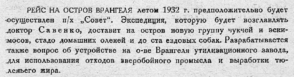 РЕЙС НА ОСТРОВ ВРАНГЕЛЯ летом 1932 г. предположительно будет осуществлен п/х „Совет". Экспедиция, которую будет возглавлять доктор Савенко, доставит на остров новую группу чукчей и эскимосов, стадо домашних оленей и до ста ездовых собак. Разрабатывается также вопрос об устройстве на о-ве Врангеля утилизационного завода, для использования отходов зверобойного промысла и выработки тюленьего жира.