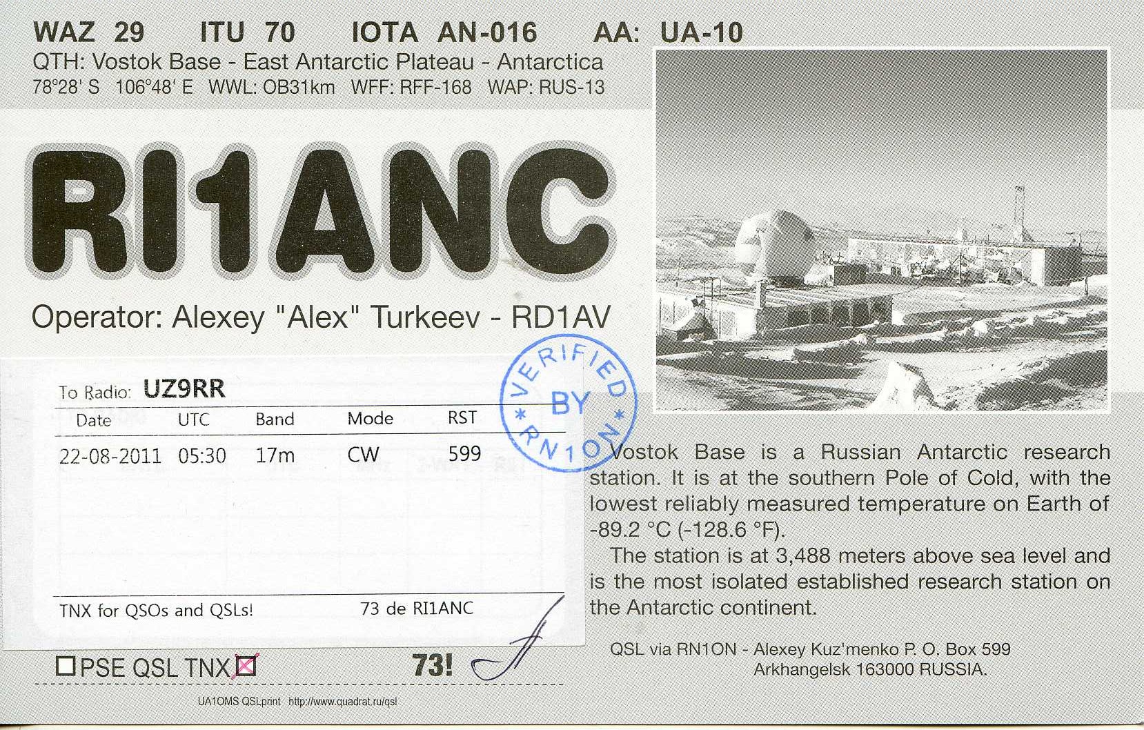 От нашего коллеги Юрия Пронина (UZ9RR) получил скан QSL-карточки со станции "Восток". С его любезного разрешения выложу здесь: