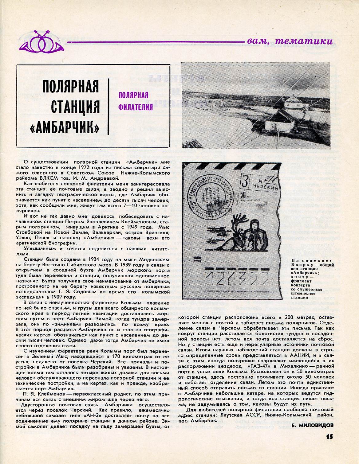 ...После успешной сдачи выпускных экзаменов в Военно-морской объединенной школе, в которой размещались курсы полярных работников Главсевморпути, я вместе с двумя товарищами по радиоотделению Женей Ланцовым и Колей Егоровым был направлен на полярную станцию в бухту Амбарчик. Проводы, несмотря на военное время, а шла весна 1944 года, были торжественные. Нас, выпускников,- радистов, метеорологов, механиков - набрался целый вагон.