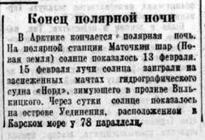 Наконец, 4 февраля, после 3-месячной полярной ночи, появился первый луч солнца,