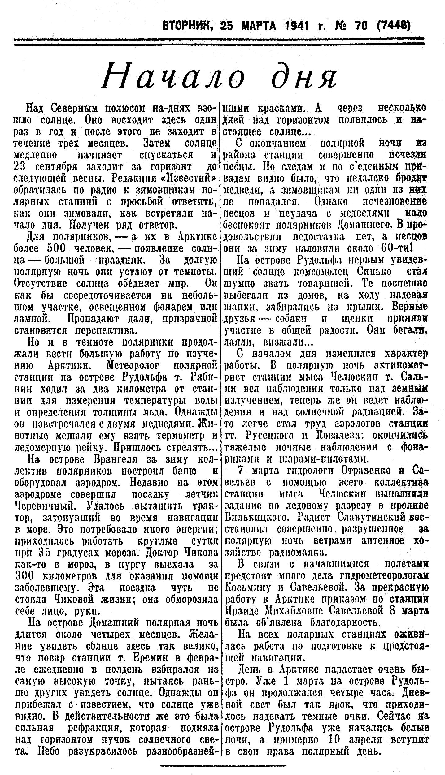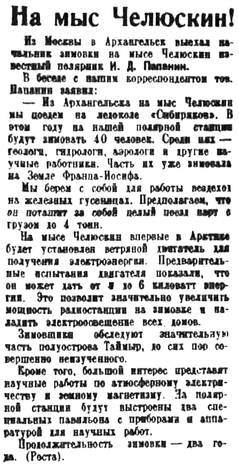 Из Москвы в Архангельск выехал начальник зимовки на мысе Челюскина известный полярник И. Д. Папанин.