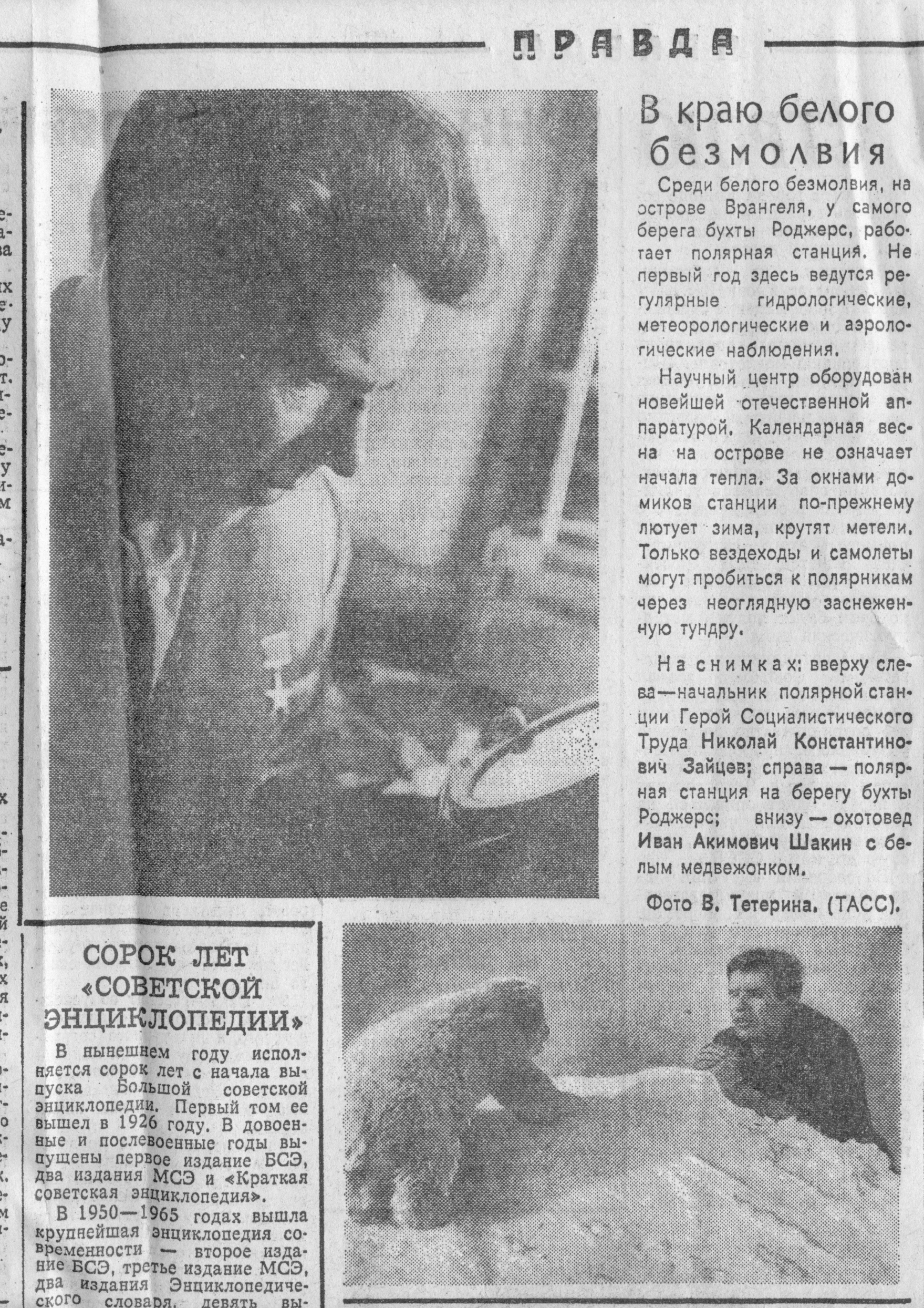 И на следующий, и еще через день все то же: туман, низкие тучи, снег. И, как только среди дня 5 сентября «в низких тучах над лагуной появляется просвет, — оба самолета один за другим отрываются и круто поднимаются в это голубое окно. Уже через полчаса начинают вырисовываться туманные очертания острова Врангеля, на горизонте все яснее выделяется темный гребень пика Берри». Еще немного — и самолет над бухтой Роджерс. «Самолет делает круг над домами, и уже можно различить людей, которые машут руками и танцуют… Наше появление было неожиданно и эффектно, — мы запоздали против назначенного срока на несколько дней, и к тому же никто не ждал сразу двух аэропланов, которые один за другим спустились в уединенную лагуну, в течение трех лет не видавшую ни одного чужого человека».