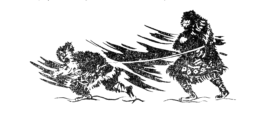 Но и этого всего оказалось мало. Для еще большей безопасности были приняты следующие мероприятия. Нужно было сделать так, чтобы покойник ни в коем случае не отыскал дороги к поселку и не увел кого-нибудь с собой; достигалось это так называемым «закрыванием» дороги. Эскимосы, обойдя раз вокруг тела, направились к колонии. Впереди шел Тагью. Выйдя на след, где прошла нарта с покойником, эскимосы завернули назад и, сделав петлю, как бы завязав узел, продолжали путь. Но скоро сделали новую петлю. Так на расстоянии полутора километра было завязано пять «узлов».