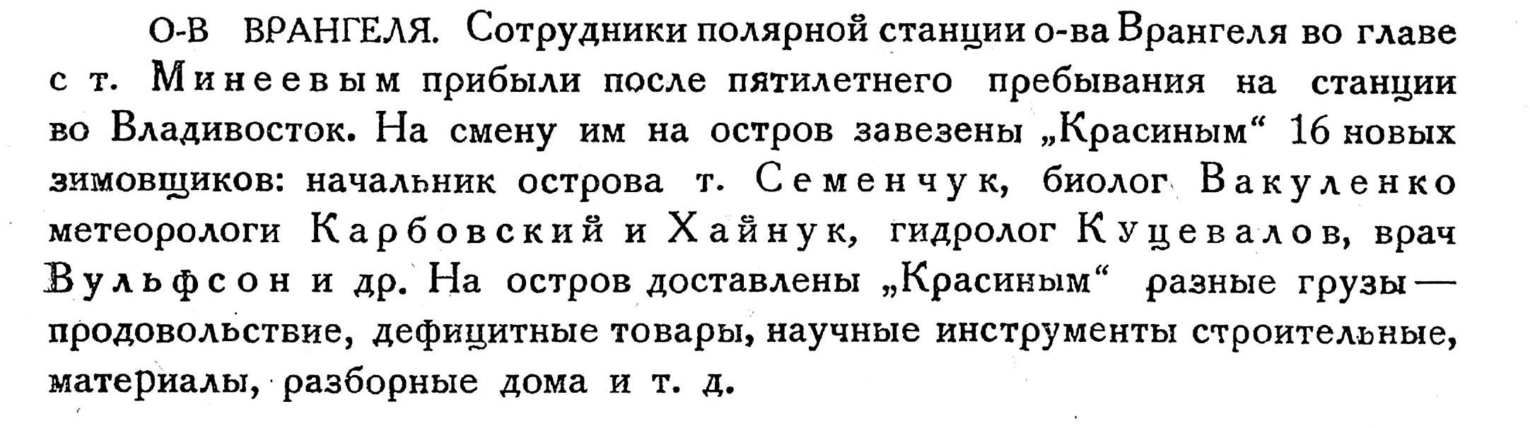 Новая смена обитателей острова Врангеля состояла из начальника колонии Минеева, его жены В. Ф. Власовой, врача Н. Е. Синадского, метеоролога К. М. Званцева, старшего радиста Ф. Т. Шатинского, его помощника В. Ф. Боганова и повара Петрика. Из прошлого состава остался И. М. Павлов, несший попрежнему обязанности зав. хозяйством и кладовщика.