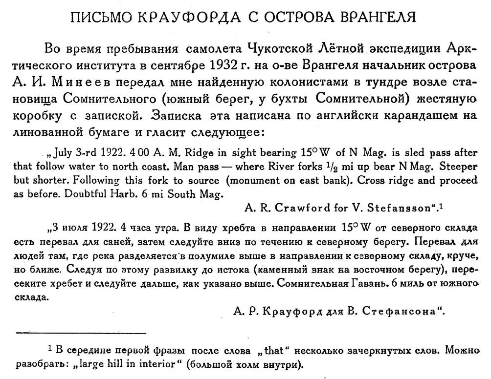 «Сомнений больше не было: летчики погибли, но где же их тела? На материк полетела радиограмма: «Всем! Всем! Всем! Самолет Эйельсона и Борланда «Гамильтон 100 002» разбился в 50 милях от мыса Северного и в 9 милях от берега. Летчики пока не найдены. Пилот Слепнев».
