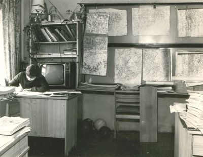 Синоптик-среднесрочник Горлова Елена Николаевна и гидролог-авиаразведчик Спирин С. А. (стоит спиной) докладывают гидрометобстановку начальнику морских операций Востока Арктики Жеребятьеву Владимиру Петровичу (сентябрь, 1994г.)