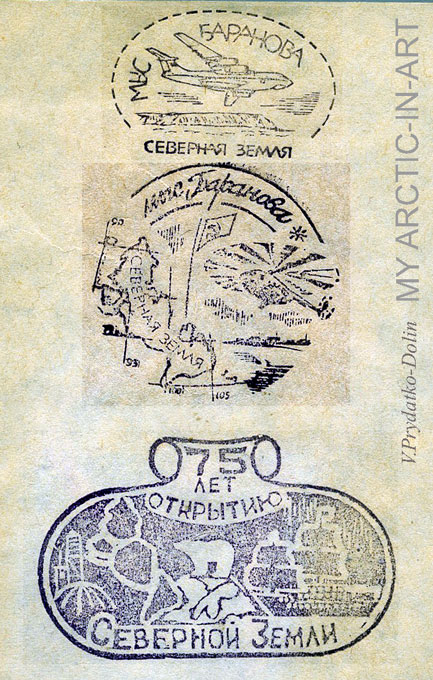 О полярной почте станции «Мыс Баранова» (Северная Земля, о.Большевик) известно совсем мало. В моей коллекции хранится три разновидности каше этой станции 1990-х. Причем, в 1992-х годах полярники использовали местные каше не только в почтовых целях, но и для изготовления вымпелов на память: в прозрачную целлофановую спайку вкладывали бумажный лист с оттисками трех каше, и кусочек красной материи (как бы фрагмент потрепанного северными ветрами красного флага), на который тоже переносили один из каше-оттисков. В итоге, идеальный почтовый комплект коллекционной полярной почты местного изготовления тех лет, представлял собой конверт (с одним или тремя каше станции), прошедший, например, почту мыса Челюскин, и вложением в виде симпатичного вымпела. Детальней...