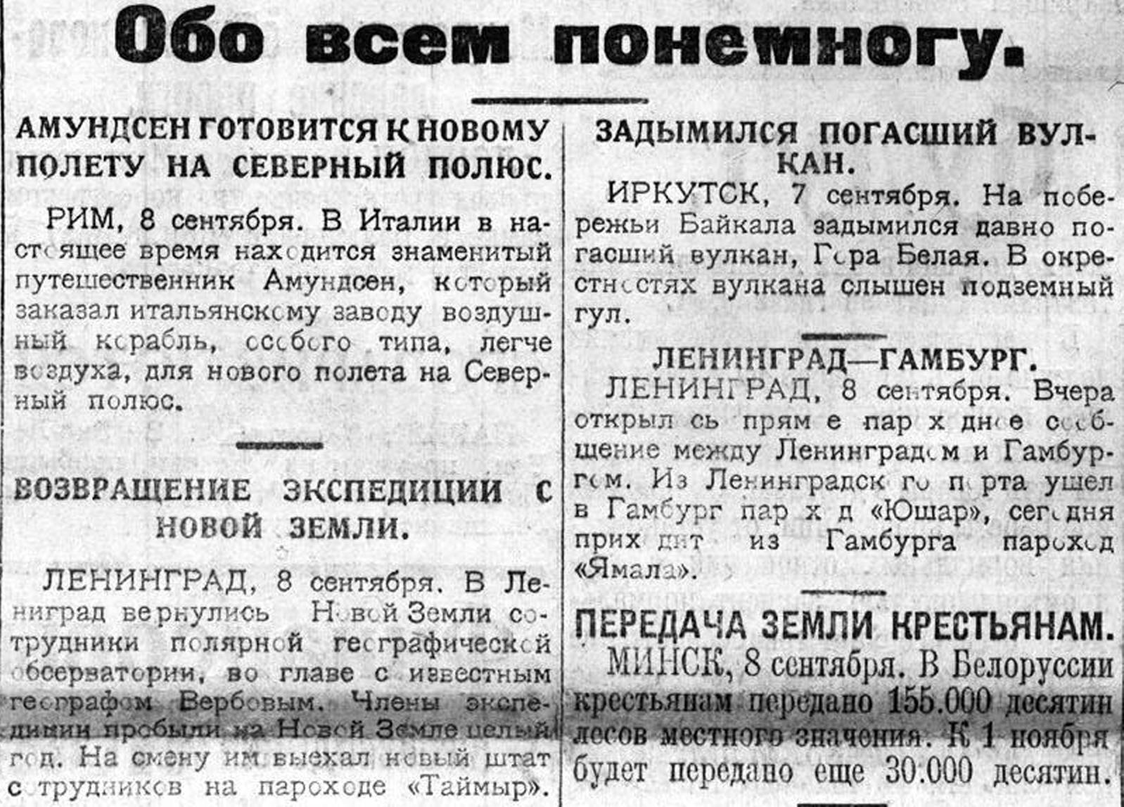 ЛЕНИНГРАД, 8 сентября. В Ленинград вернулись Новой Земли сотрудники полярной географической обсерватории, во главе с известным географом Вербовым. Члены экспедиции пробыли на Новой Земле целый год. На смену им выехал новый штат сотрудников на пароходе «Таймыр».