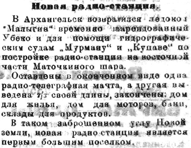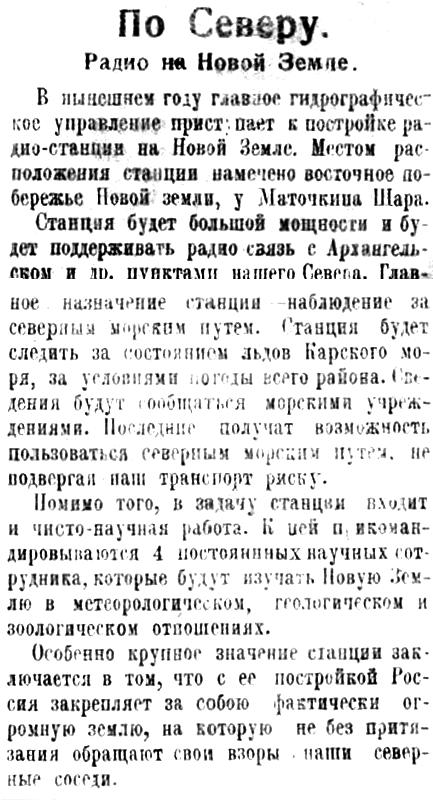 В нынешнем году главное гидрографическое управление приступает к постройке радио-станции на Новой Земле. Местом расположения станции намечено восточное побережье Новой земли, у Маточкина Шара.