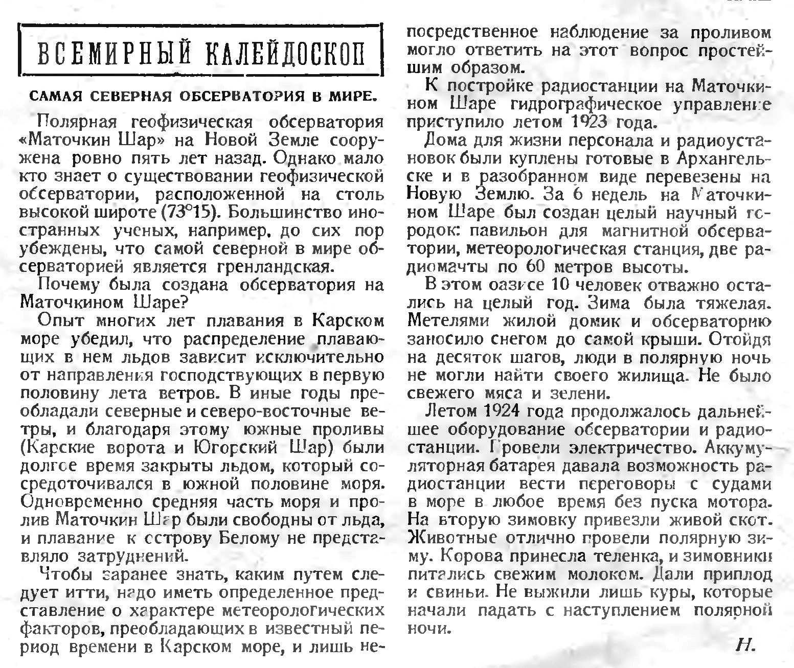 Как только огромные события, которые пережила наша страна, дали возможность обратить внимание и в эту сторону, тотчас же Правительство СССР решило построить на восточном берегу Новой Земли в проливе «Маточкин Шар», по возможности ближе к Карскому морю, Геофизическую Обсерваторию и радио-станцию. Это сооружение, составлявшее одну часть обширной программы, имело целью путем регулярных метеорологических и ледовых наблюдений облегчать путь судам, идущим из Европы в устья великих сибирских рек.