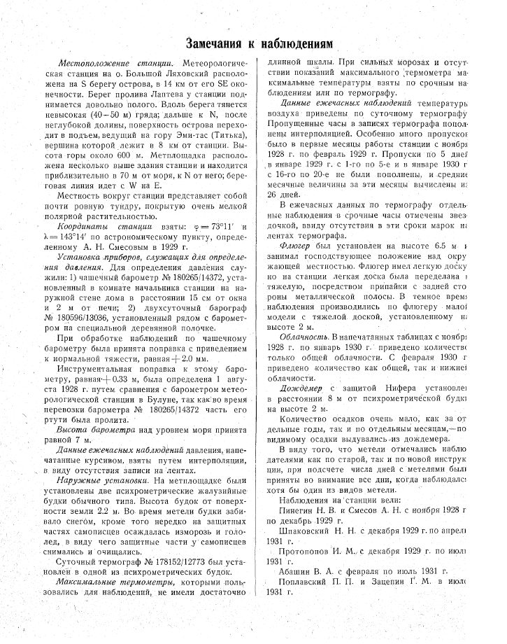 Из книги: МЕТЕОРОЛОГИЧЕСКИЕ НАБЛЮДЕНИЯ ПОЛЯРНОЙ СТАНЦИИ НА О. БОЛЬШОЙ ЛЯХОВСКИЙ. Зимовки: 1928-1929, 1929-1930, 1930-1931