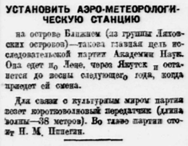 на острове Ближнем (из группы Ляховских островов) — такова главная цель исследовательской партии Академии Наук. Она едет по Лене, через Якутск и останется до весны следующего года, когда приедет ей смена.