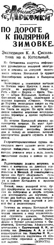Зимовка на острове Котельный будет одной из самых серьезных арктических зимовок в силу исключительной суровости климата, бытовых трудностей и условий работы. Экспедиция в составе руководителя т. Сысолятнна, Константина Афанасьевича, метеоролога т. Сысолятиной К. И., механика тов. Демидова А. А. и плотника-строителя тов. Назарева И. Н., — готова выполнить порученное ей правительством серьезное и ответственное задание. (ВСРОСТА).