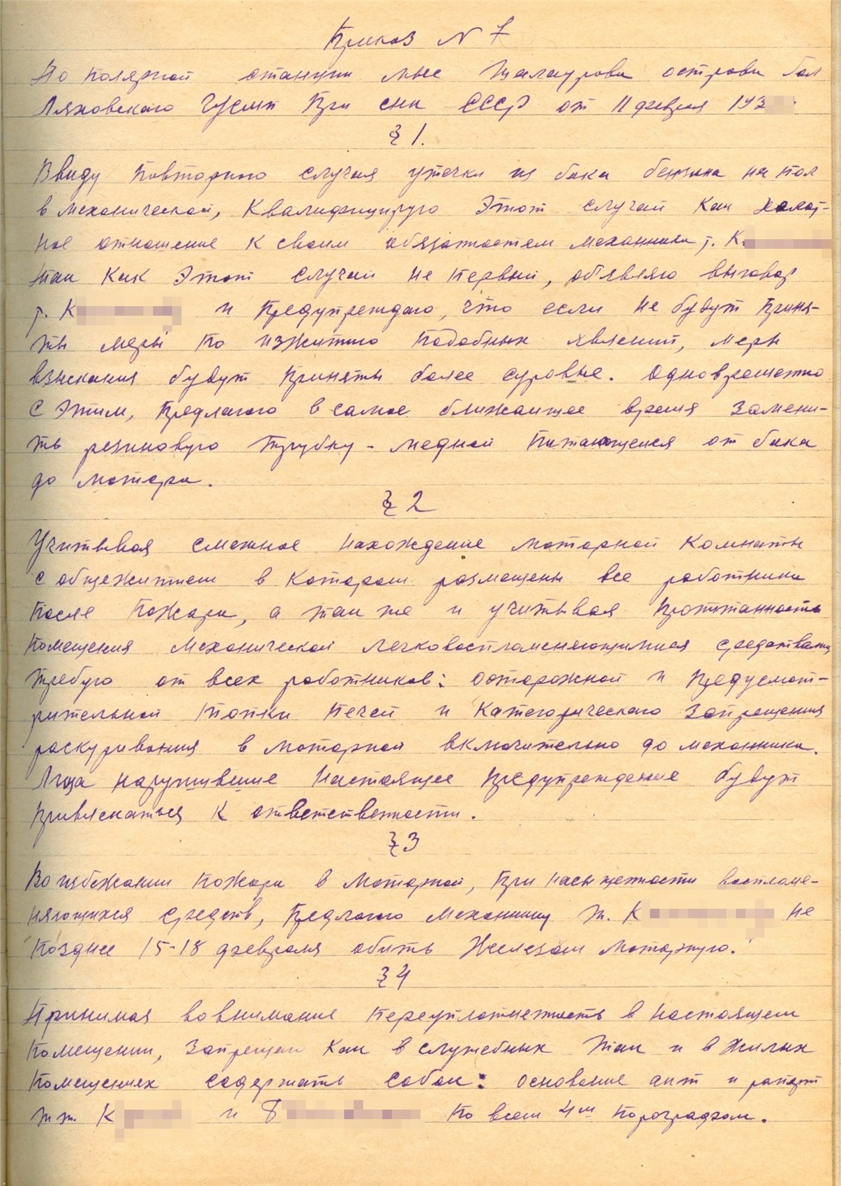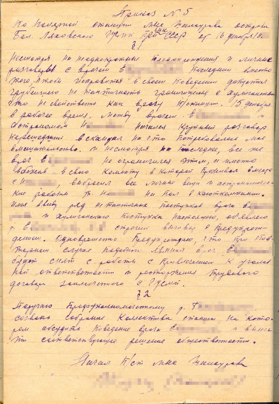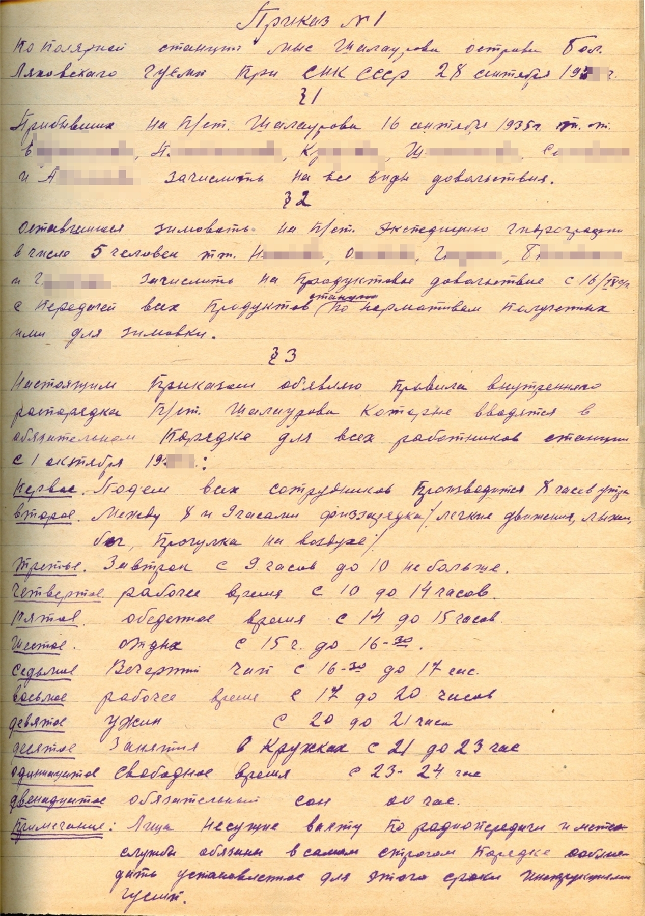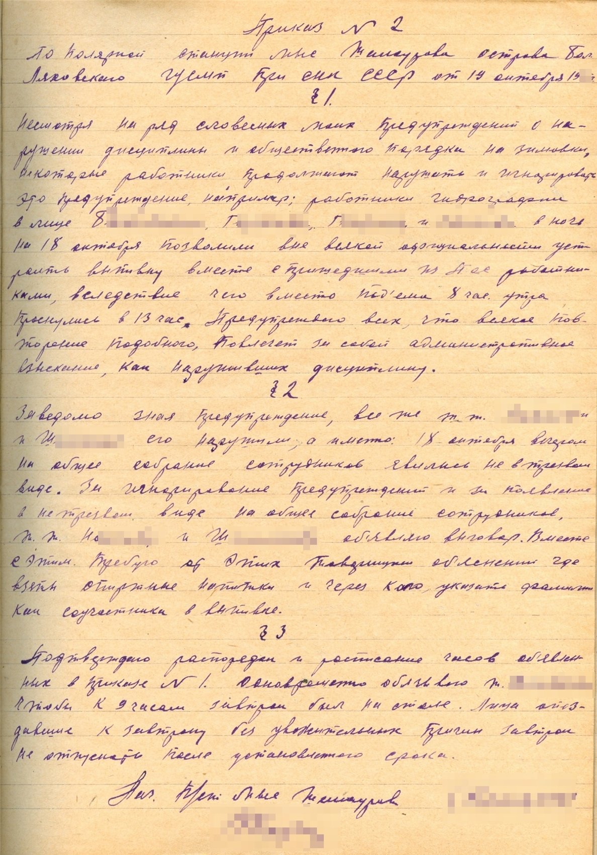 §1 Несмотря на ряд словесных моих предупреждений о нарушении дисциплины и общественного порядка на зимовке, некоторые работники продолжают нарушать и игнорировать это предупреждение, например: работники Гидрографии в лице Б., Г., Г. и О. в ночь на 18 октября позволили вне всякой ... (неразб.) устроить выпивку вместе с пришедшими из Пос. [очевидно, Пос. означает поселок Дымный - небольшое поселение в 20 км. от станции] работниками, вследствие чего вместо подъема в 8 часов утра проснулись в 13 час. Предупреждаю всех, что всякое повторение подобного повлечет за собой административное взыскание, как нарушивших дисциплину.