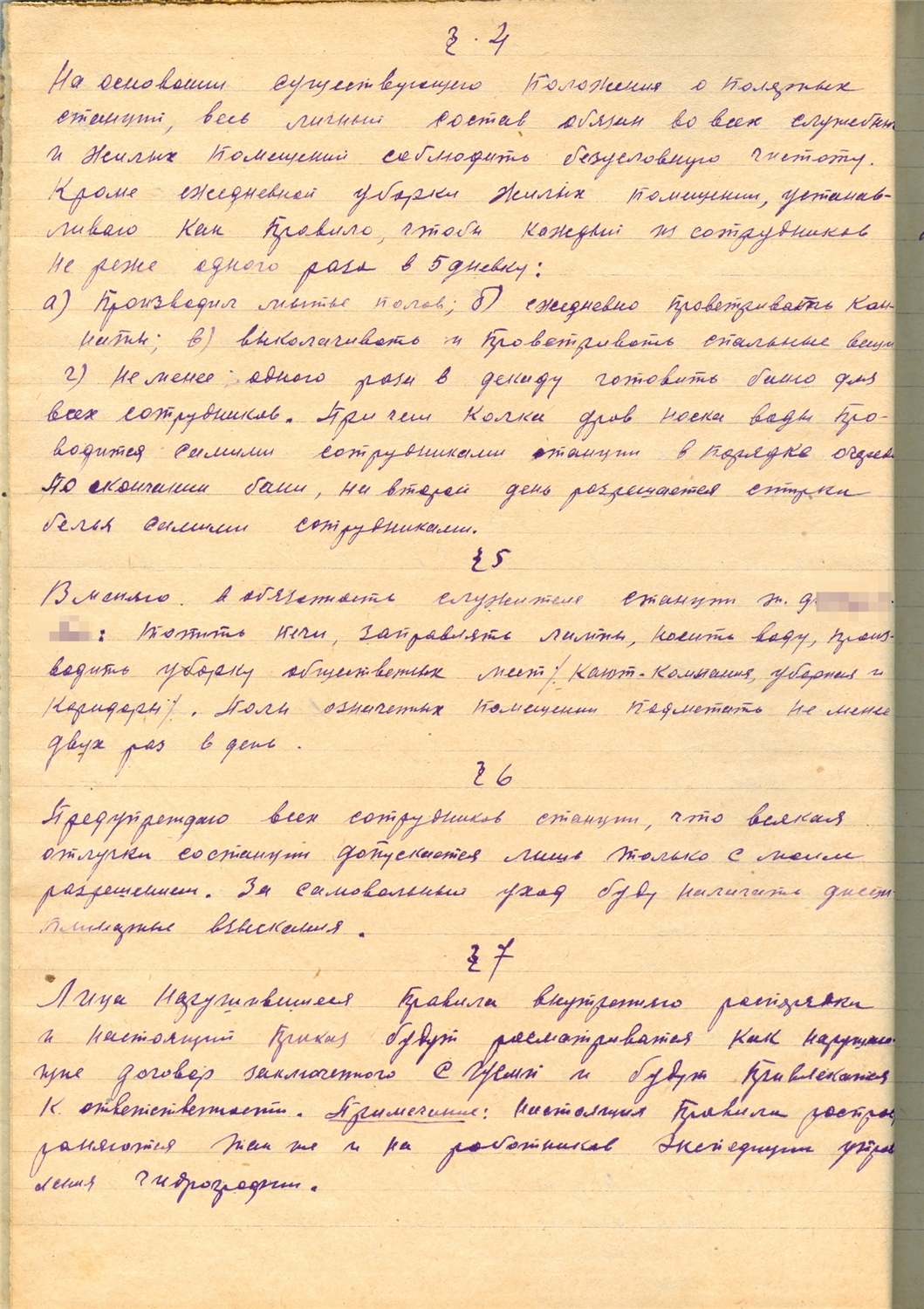 §4. На основании существующего положения о Полярных станциях, весь личный состав обязан во всех служебных и жилых помещениях соблюдать безусловную чистоту. Кроме ежедневной уборки жилых помещений, устанавливаю как правило, чтобы каждый из сотрудников не реже одного раза в 5дневку: