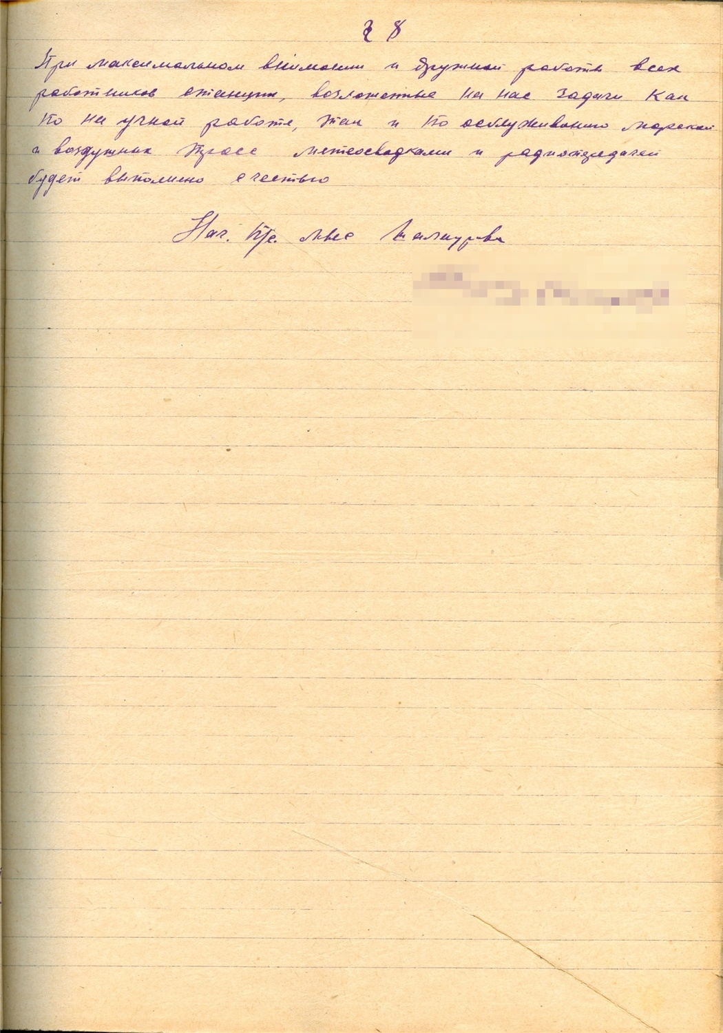 §8. При максимальном внимании и дружной работе всех работников станции, возложенные на нас задачи как по научной работе, так и по обслуживанию морской и воздушной трасс метеосводками и радиопередачей будут выполнены с честью.