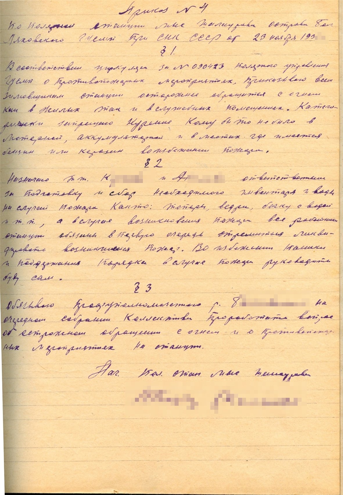 §3. Обязываю профуполномоченного т. Б. на очередном собрании коллектива проработать ... (неразб.) об осторожном обращении с огнем и о противопожарных мероприятиях на станции.