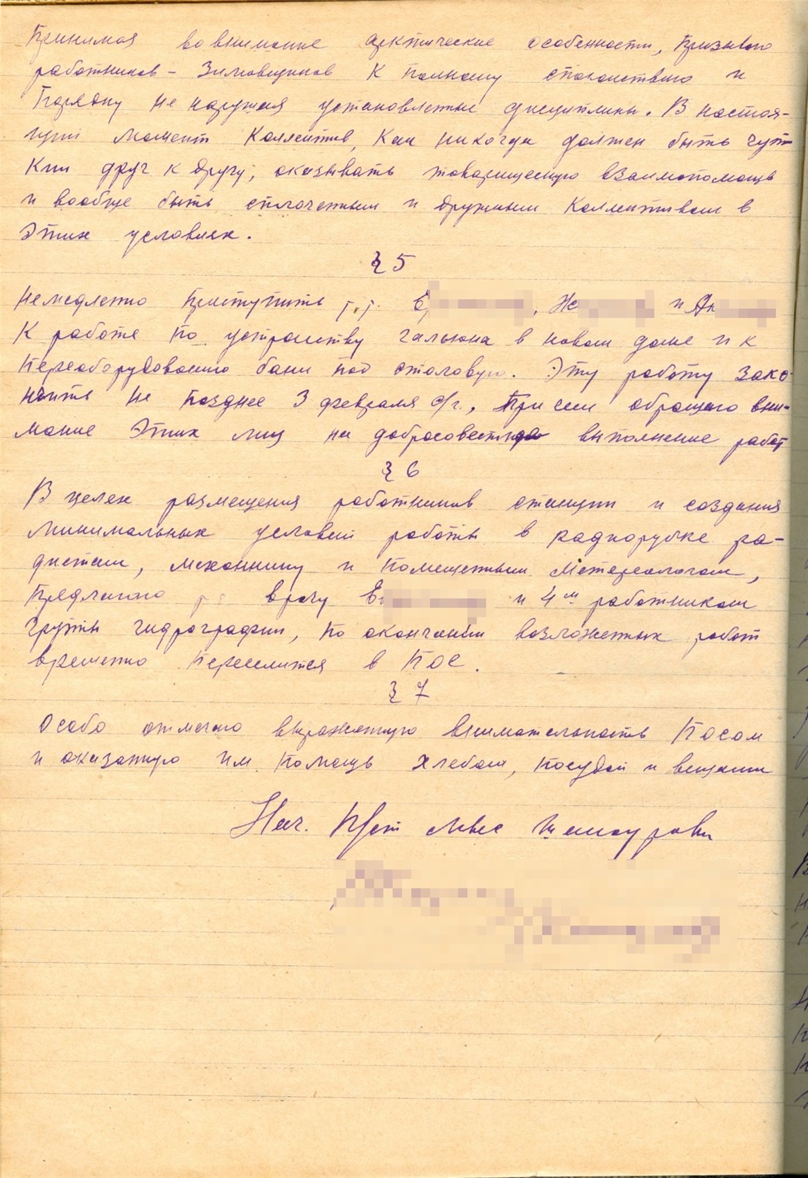 §5. Вменяю в обязанности служителя станции т. Ф.: топить печи, заправлять лампы, носить воду, производить уборку общественных мест (кают-компания, уборная и коридоры). Полы означенных помещений подметаются не менее двух раз в день.
