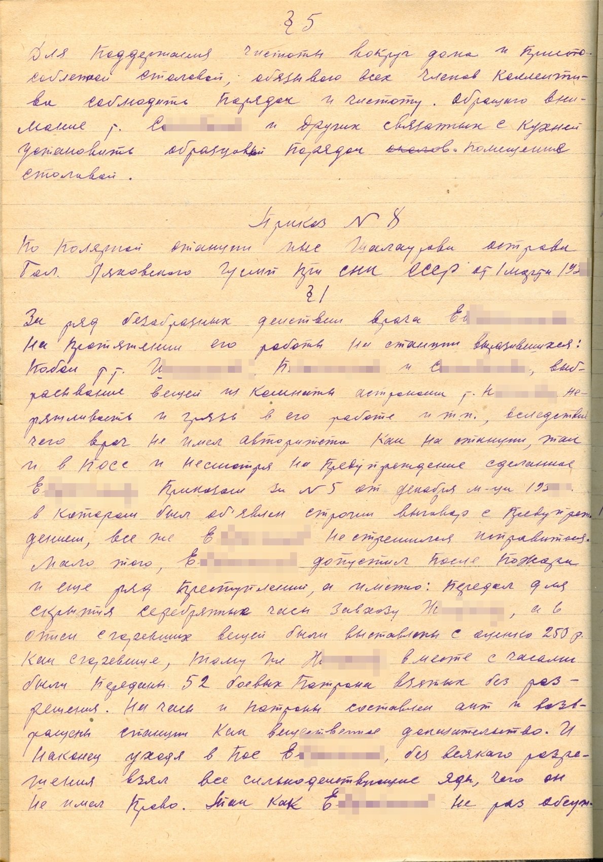 §2. Заведомо зная предупреждение, все же тт. Н. и Ш. его нарушили, а именно: 18 октября вечером на общее собрание сотрудников явились не в трезвом виде. За игнорирование предупреждений и за появление в нетрезвом виде на общее собрание сотрудников, тт. Н. и Ш. объявляю выговор. Вместе с этим требую от этих товарищей объяснений где взяты спиртные напитки и через кого, указать фамилии соучастников в выпивке.
