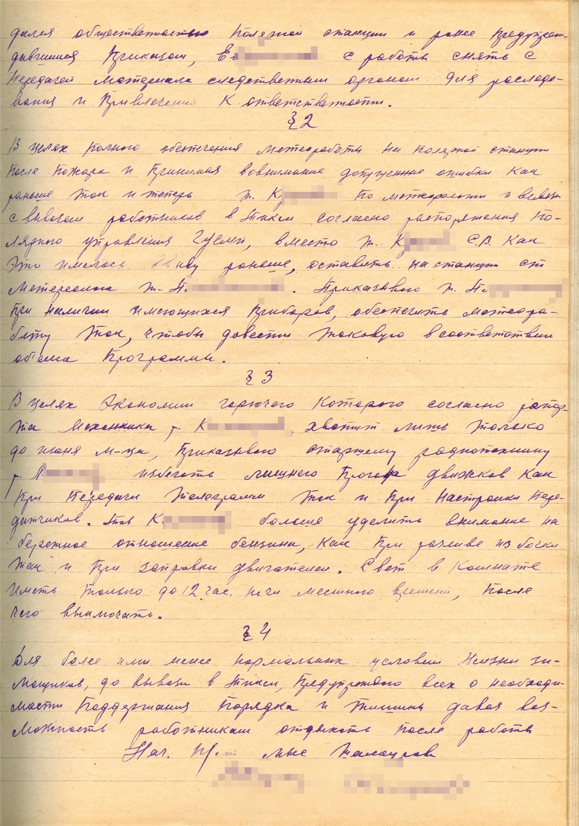 §2. Назначаю тт. К. и А. ответственными за подготовку и сбор необходимого инвентаря и воды на случай пожара, как то: топоры, ведра, бочку с водой и т.п., а в случае возникновения пожара все работники станции обязаны в первую очередь стремиться ликвидировать пожар. Во избежании паники и поддержания порядка в случае пожара руководить буду сам.