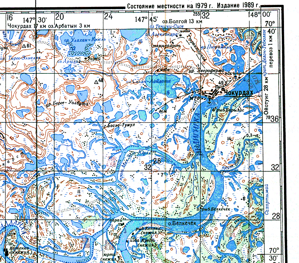 Л. 112. Метеостанция Чокурдах существует с 1 октября 1939г. Находится на территории гидроавиапорта УПА «Чокурдах» в 150 м. от первых строений селения Чокурдах, нынешнего районного центра Аллаиховского района и в 160 м. от берега р. Индигирка. Гора Чокурдах в переводе с якутского – «Кремневая гора».