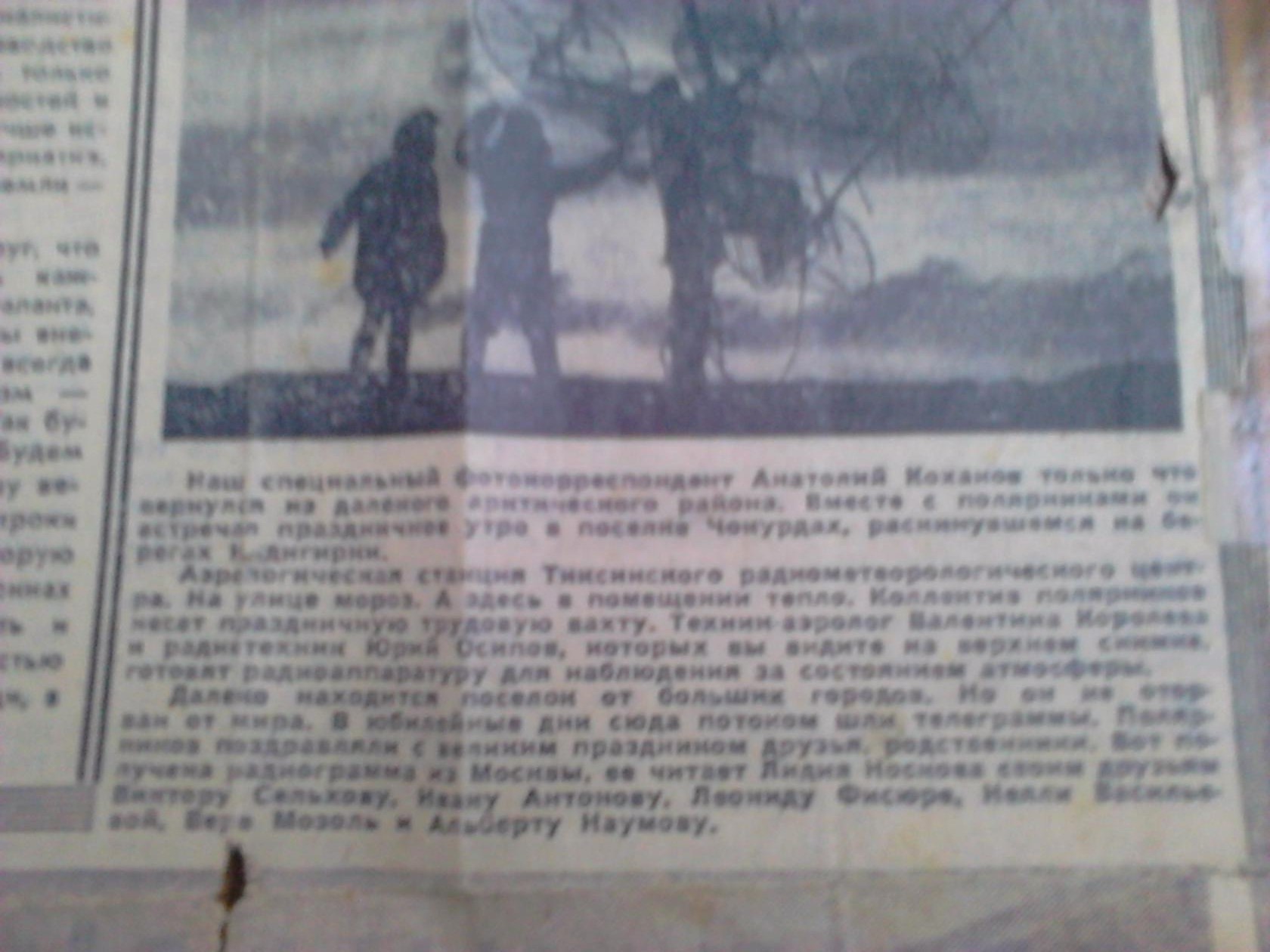 Заметка в газете "техник-аэролог Валентина Королёва и радиотехник Юрий Осипов готовят радиоаппаратуру для наблюдения за состоянием атмосферы"