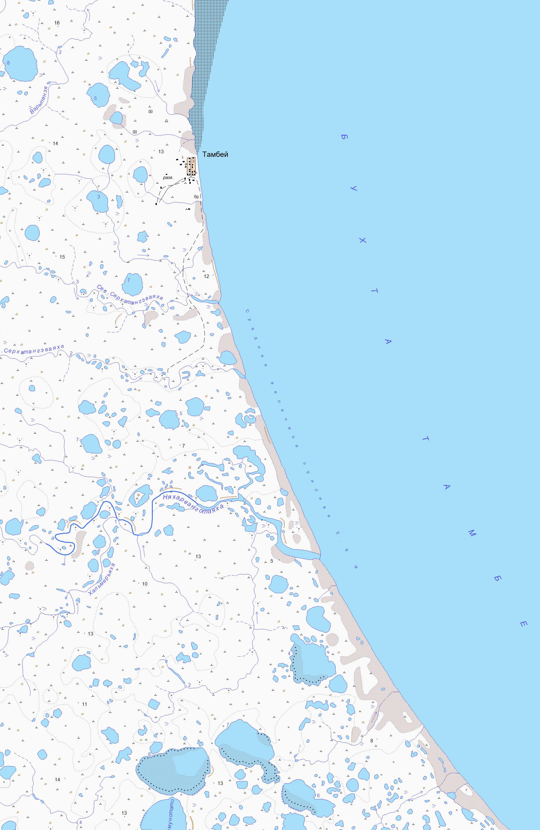 Южнее ТАМБЕЯ была полярная станция ТАДИБИЯХА в устье одноименной речки с хорошей рыбалкой.Там мы на пароходе СУХУМИ в сентябре 1965 года выгружались, а в 1963 году пх СУХУМИ сидел там на мели. Почему-то о ней нет даже упоминаний.